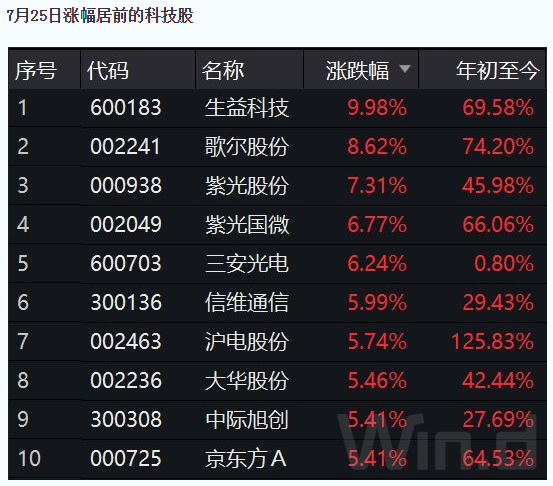 事实上,本周以来,科技龙头股表现出色。Win d数据显示,截至7月25日,本周以来,科技龙头板块涨幅达5.62%。其中,歌尔股份、信维通信、韦尔股份涨幅均超15%。